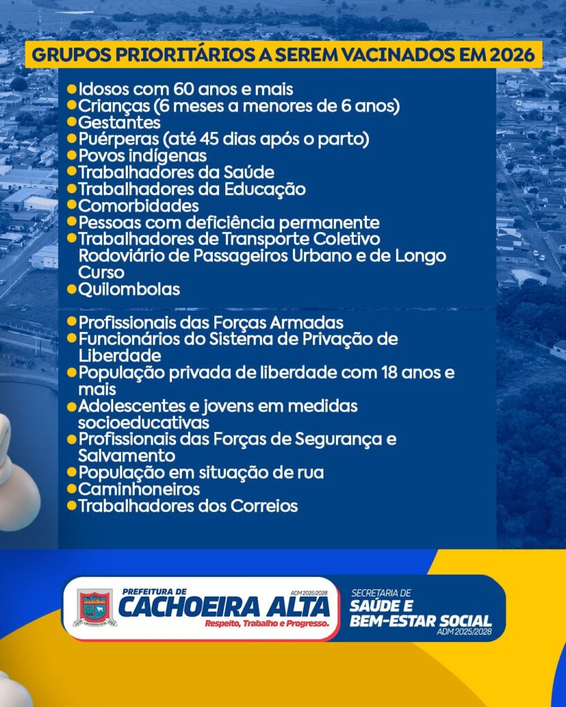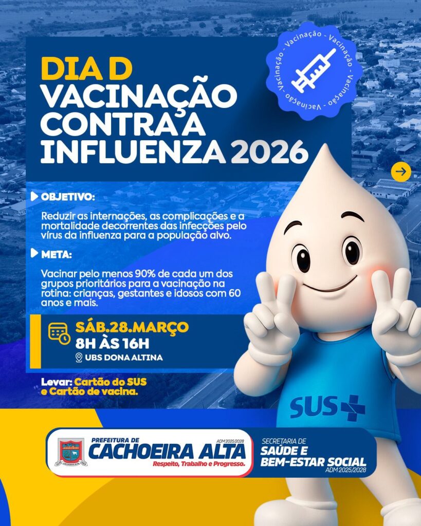 A Prefeitura de Cachoeira Alta, por meio da Secretaria de Saúde e Bem-estar Social, realiza o Dia D de Vacinação contra a Influenza 2026.