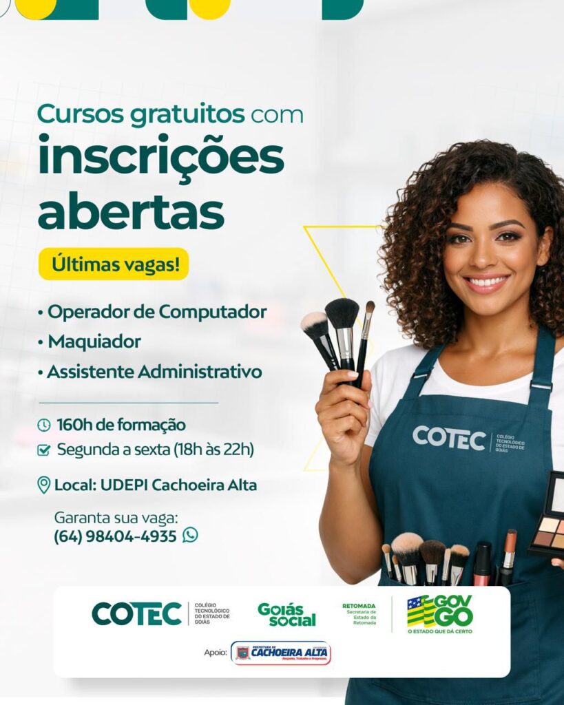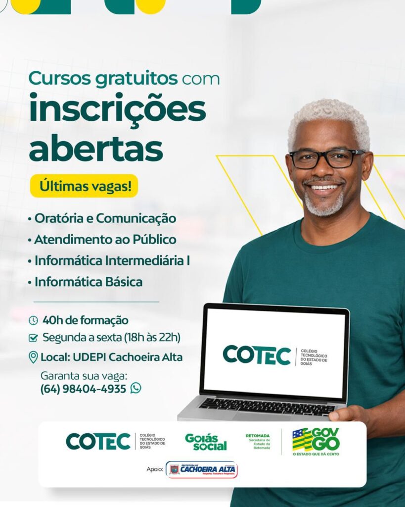Estão abertas as inscrições para cursos gratuitos do COTEC em Cachoeira Alta! Uma grande oportunidade para quem deseja se capacitar, aprender novas habilidades e se preparar para o mercado de trabalho.