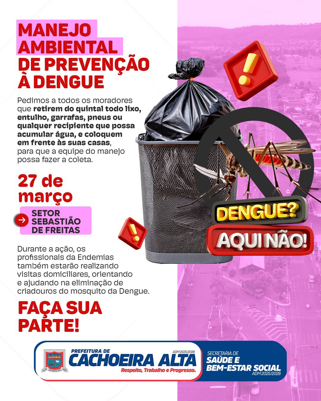 Pedimos aos moradores que retirem do quintal todo lixo, entulhos, garrafas, pneus ou qualquer recipiente que possa acumular água, e coloquem em frente às residências para que a equipe realize a coleta.