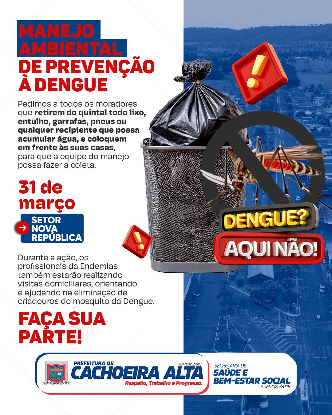 Pedimos aos moradores que retirem do quintal todo lixo, entulhos, garrafas, pneus ou qualquer recipiente que possa acumular água, e coloquem em frente às residências para que a equipe realize a coleta.